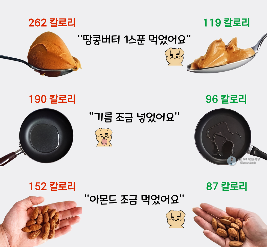 칼로리 착각은 특히 에너지 밀도가 높은 식품에서 자주 발생합니다. 같은 한 숟가락, 같은 한 줌이라도 사람마다 기준이 다르기 때문입니다.
