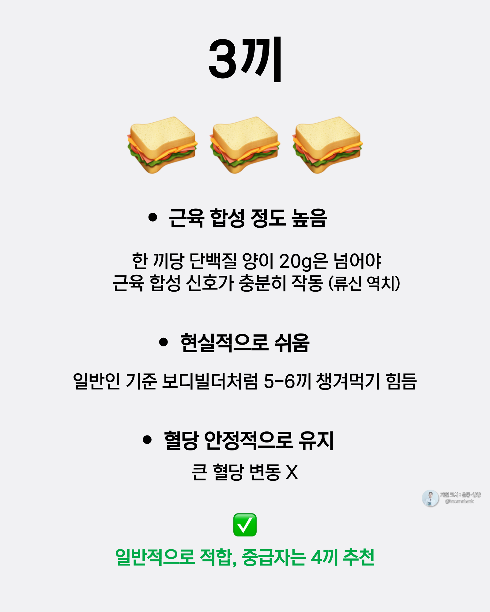 근육 성장 자체가 최우선이라면, 2끼는 불리하게 느껴질 수 있습니다. 다만 개인차가 커서, 단백질 총량이 잘 채워지는지가 더 중요합니다.