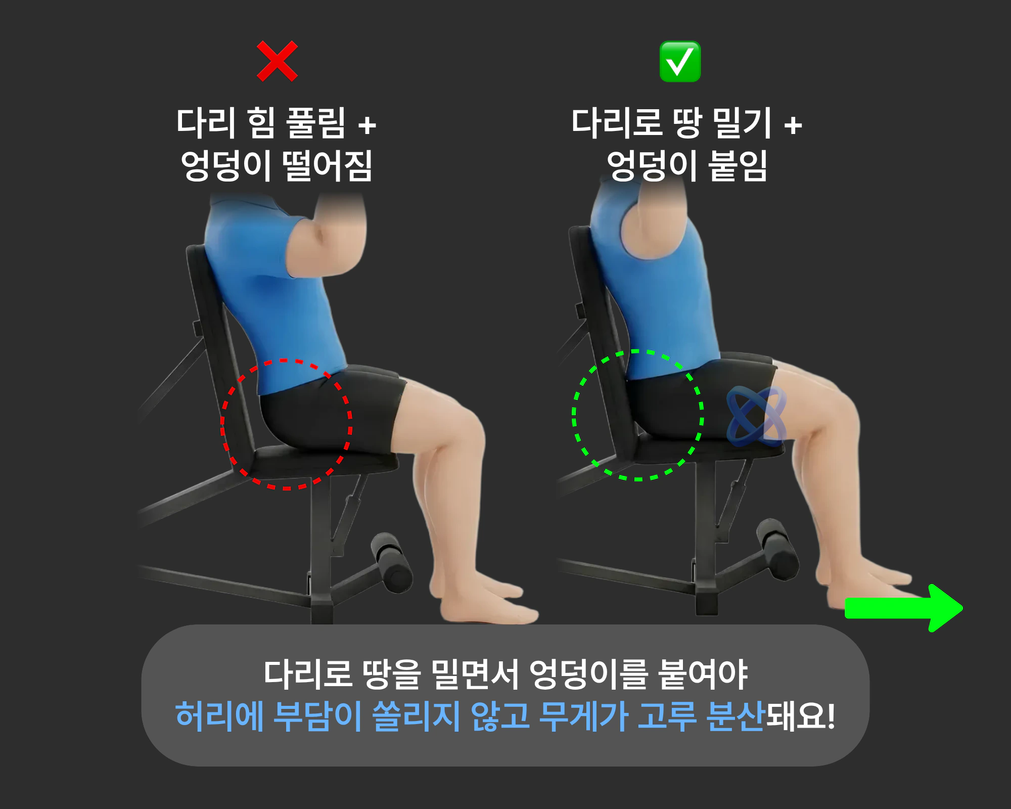 - 다리로 바닥을 밀어 엉덩이를 고정하면 허리 부담이 크게 줄어요.