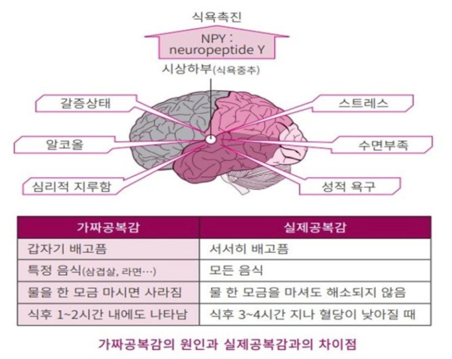 가짜공복감은 실제로 에너지가 필요한 상태가 아님에도 불구하고, 다양한 요인 때문에 배고픔으로 느끼게 되는 현상입니다. 몸이 보내는 갈증, 스트레스, 피로 신호가 배고픔으로 번역되는 경우가 있어요.