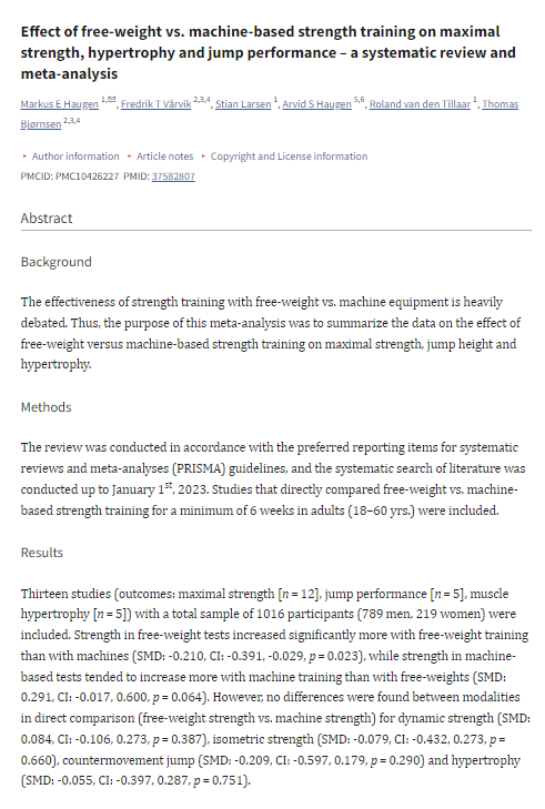 - Free weights vs machine strength training (PubMed 검색): https://pubmed.ncbi.nlm.nih.gov/?term=free+weights+vs+machine+strength+training