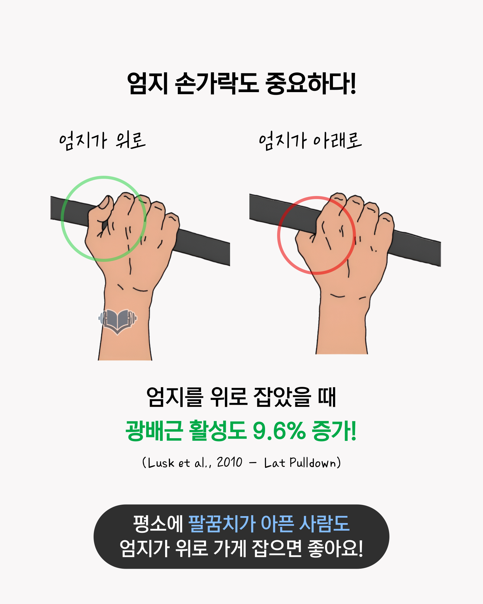 연구에서도 랫풀다운에서 그립 방식이 근활성에 영향을 줄 수 있음을 보고합니다. (PubMed: PMID 20543740) 또한 그립 폭이나 조건 변화에 따라 광배와 보조근 활성 양상이 달라질 수 있다는 연구도 있습니다. (PubMed: PMID 12423182)