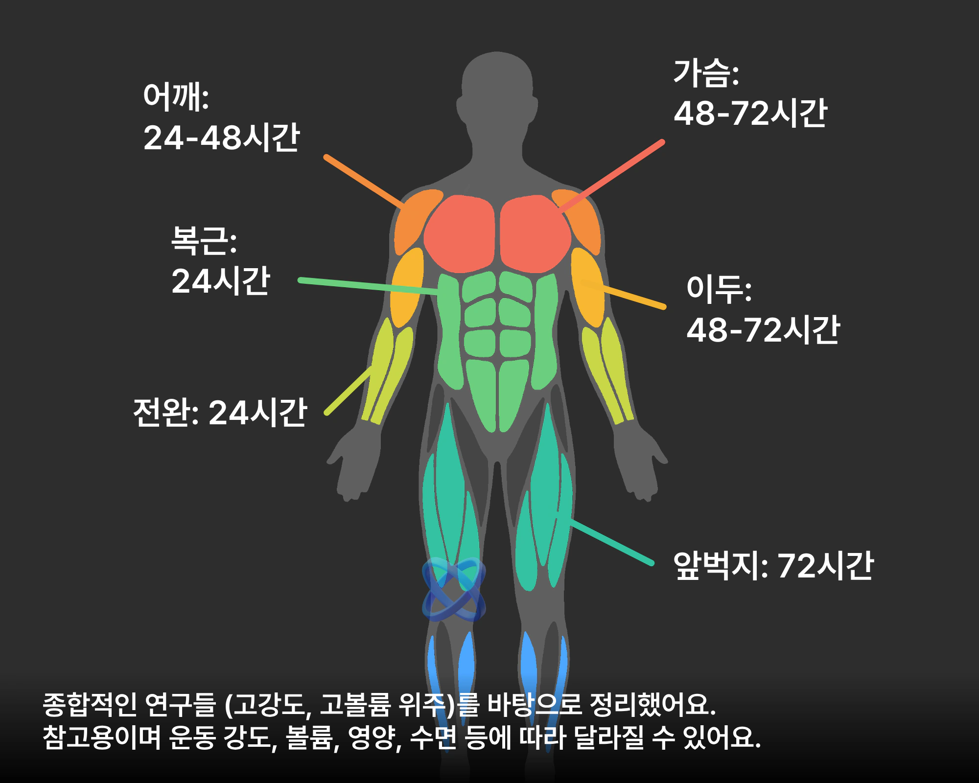 그래서 오늘은 부위별로 대략 얼마나 쉬어야 다음 세션에서 제대로 힘을 낼 수 있는지 연구 자료를 기반으로 깔끔하게 정리해드릴게요!