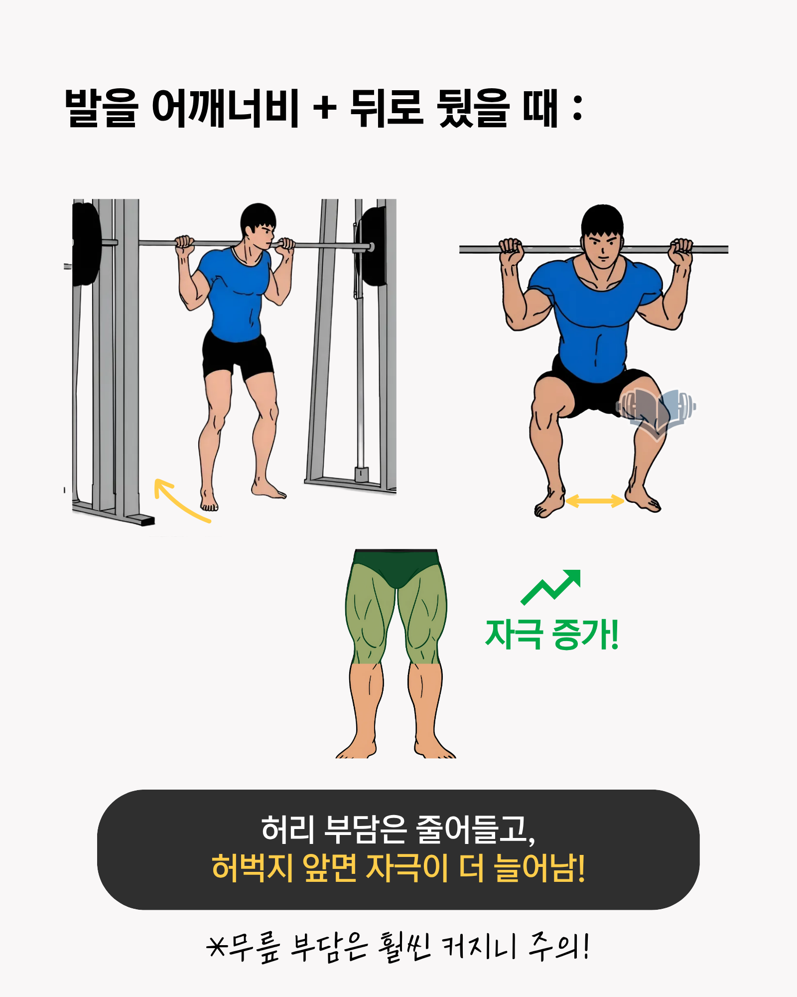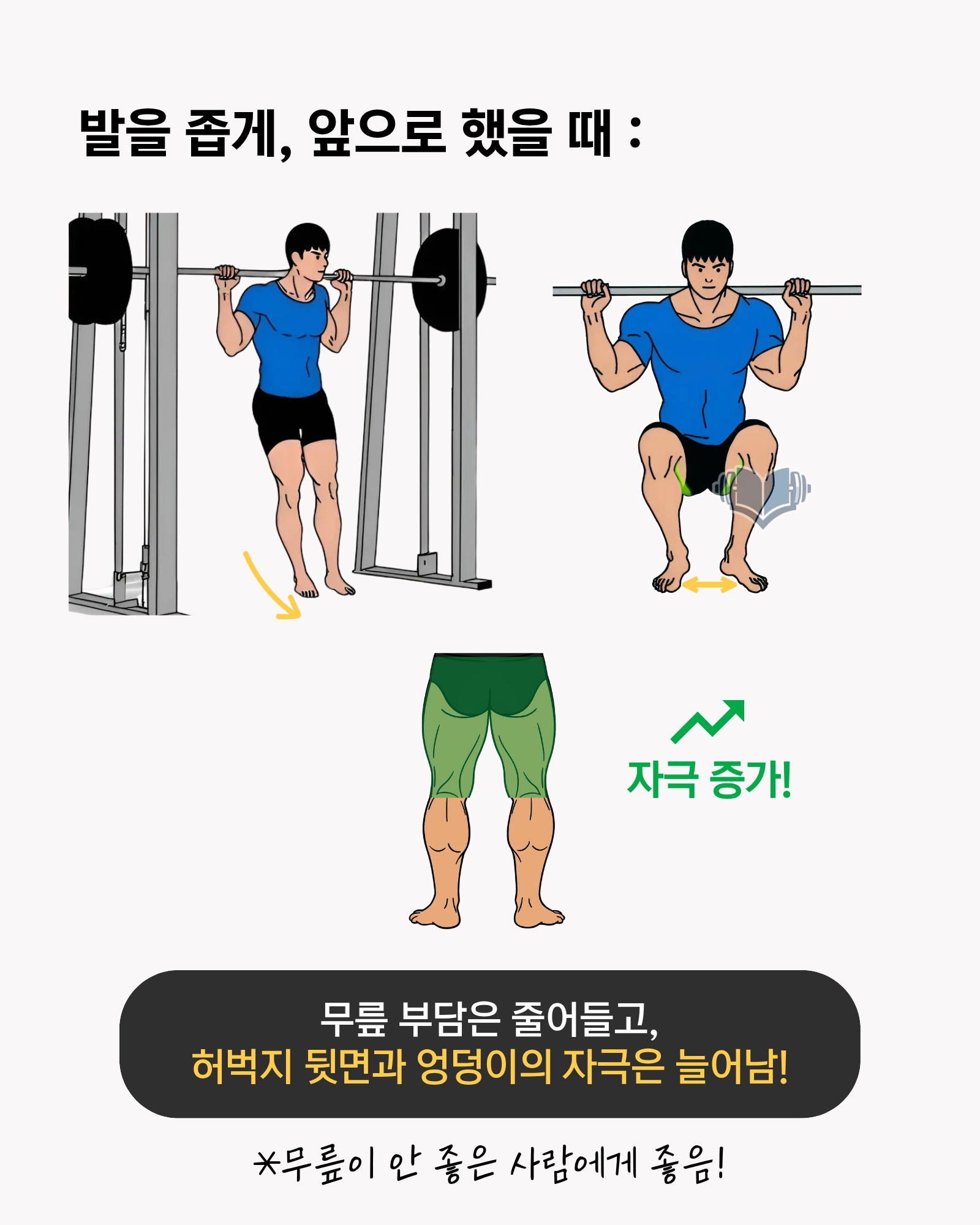 - 무릎이 아프면 좁은 스탠스 쪽을 시도해보시고, 무게를 먼저 낮추는 편이 좋습니다