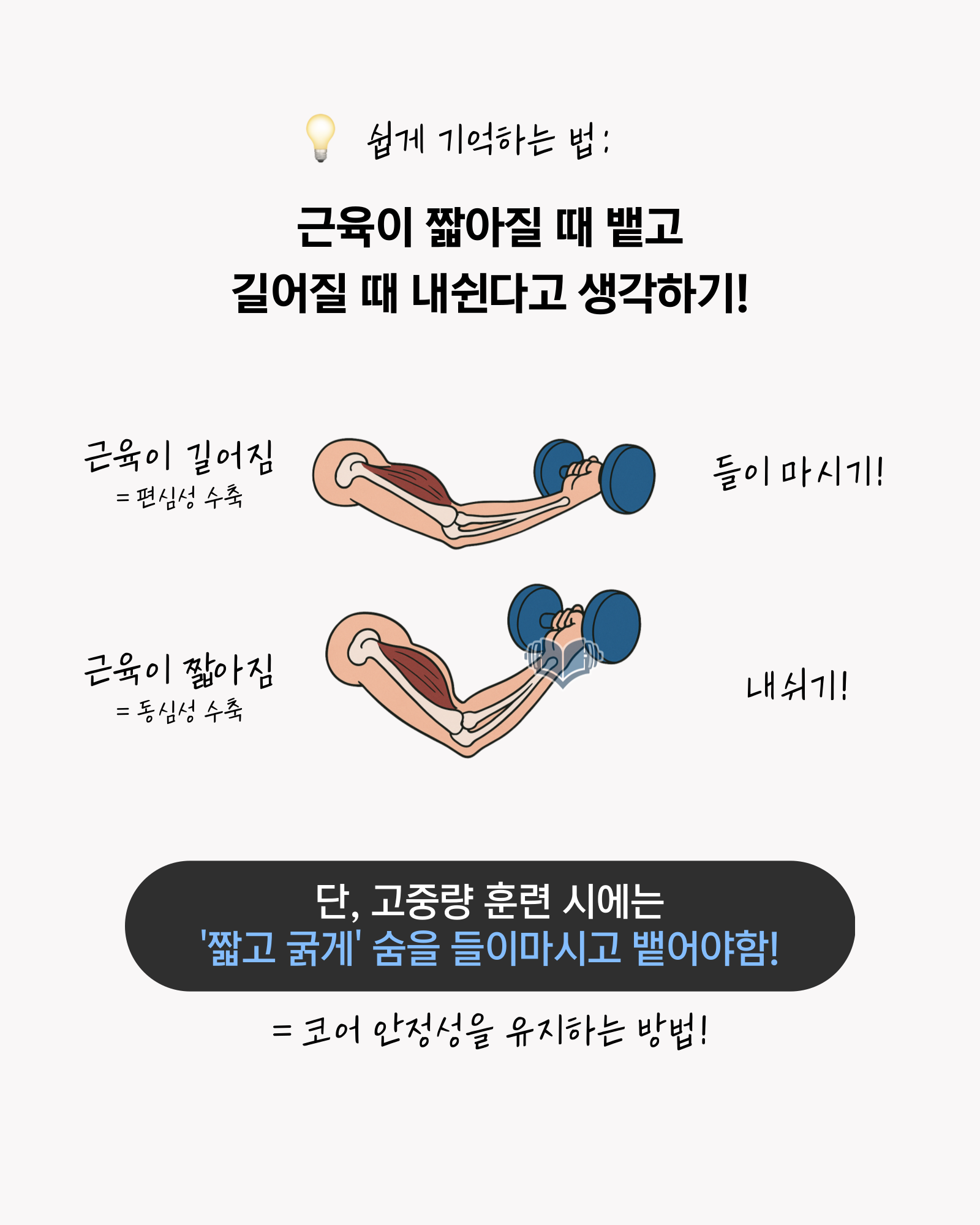- 힘을 쓰는 구간(근육이 짧아질 때)에는 보통 내쉬는 쪽이 편합니다.